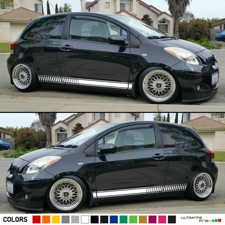 UltimatePro Designs has Vinyl Graphics, Stripe Kits and Decals for your Toyota Yaris Model! Professional Quality High Performance Vinyl Graphic Film! We feature an amazing variety of vehicle specific rally racing stripe kits, lower rocker panel stripes, factory style hood graphics, and side body stripe kits available for the wide range Toyota Yaris model vehicles listed.